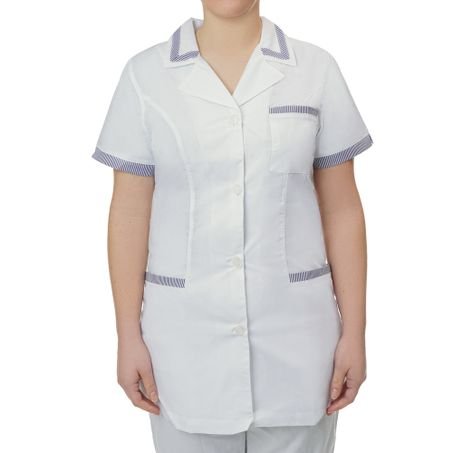 Casacca bianca, con finiture a righe di colore blu, ideale per banconisti e punti vendita.
